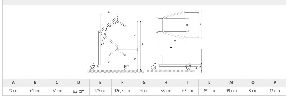 Dvigalo je izdelano iz robustnega, barvanega jekla, ki zagotavlja visoko mehansko odpornost in dolgo življenjsko dobo. Opremljeno je s štirimi vrtljivimi kolesi, od tega sta dve opremljeni z zavorami, kar zagotavlja stabilnost med uporabo. Posebna pozornost je namenjena tudi varnostnemu sistemu – zasilni gumb za zaustavitev omogoča takojšnjo prekinitev delovanja v nujnih primerih.